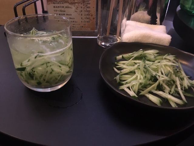 お客さんにきゅうりの千切りをお酒に入れるとのみやすくなるってきいて吉四六ロックにいれたらまろやかになった!麦の味が薄くなった!これマジック!!笑