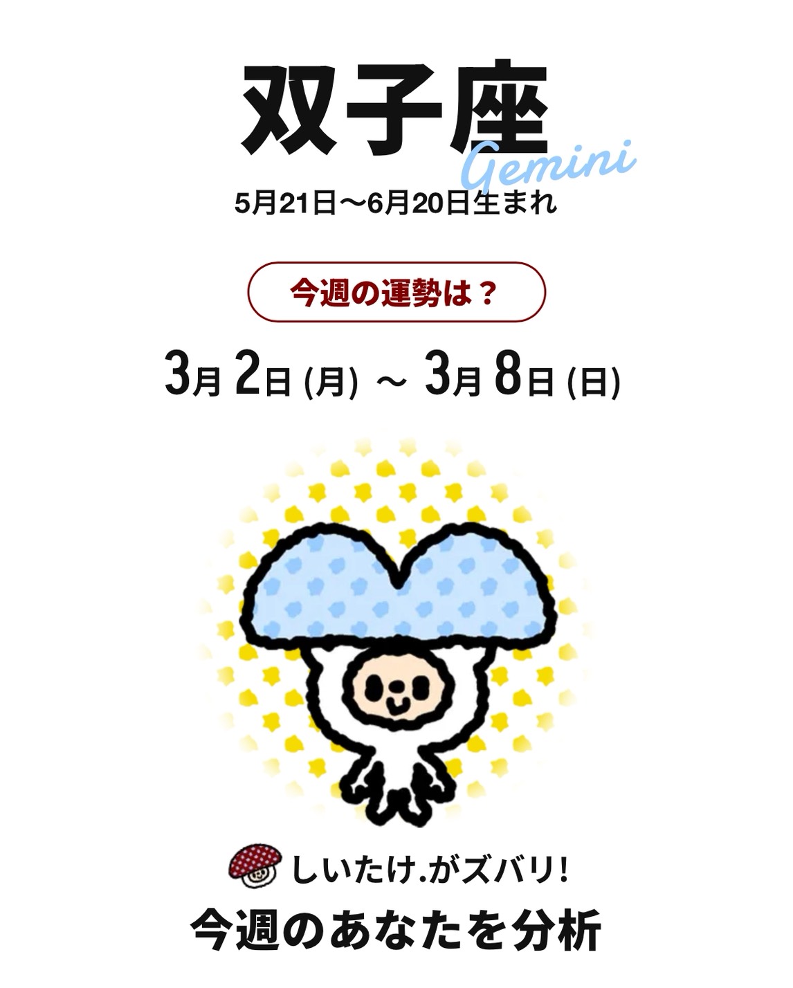 しいたけ占いは、週間占いと半期占いがあって、星座ごとに占ってくれます!🍄
